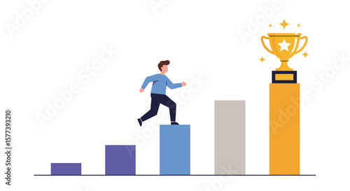 Achieving success: businessman climbing bar chart to reach golden trophy