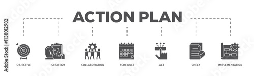 Action plan infographic icon flow process which consists of objective, strategy, collaboration, schedule, act, launch, check, and implementation icon live stroke and easy to edit .