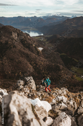 active woman in red pants hiking