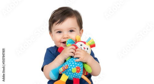 Adorable baby boy playing with colorful plush toy smiling happily on a black isolated background on transparent background