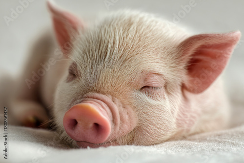 Adorable baby piglet peacefully sleeping on a soft surface with closed eyes and relaxed expression in natural soft lighting close-up portrait