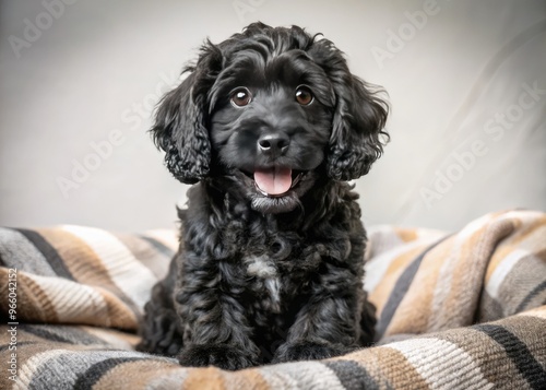 Adorable Black Cockapoo Puppy With Perky Ears And Happy Expression, Sitting On A Cozy Blanket
