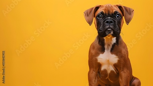 Adorable brown boxer puppy sitting against a bright yellow background, showcasing its cute and expressive face.