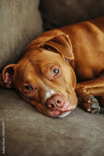 Adorable Brown Dog Resting Comfortably on Sofa, Close-Up View