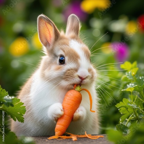 Adorable bunny enjoys a fresh carrot snack in a vibrant garden setting outdoors