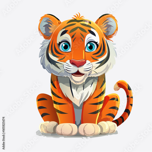 Adorable cartoon tiger cub sitting upright with curious expression in a minimalist design