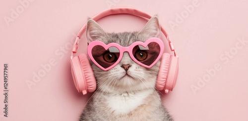 Adorable cat wearing pink heart-shaped sunglasses and matching headphones against a soft pink background, perfect for Valentine’s Day promotions, pet-themed designs, and playful advertisements