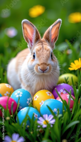 Adorable Easter bunny nestled amongst colorful eggs on a vibrant green spring lawn, candy, meadow