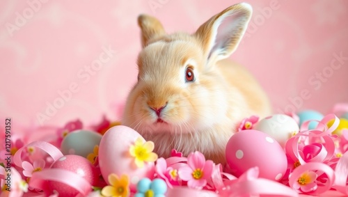Adorable easter bunny relaxing among colorful eggs and ribbons