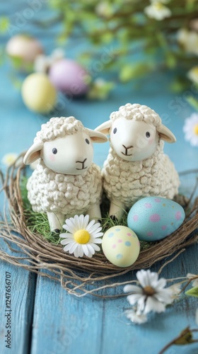 adorable easter lambs in nest with eggs