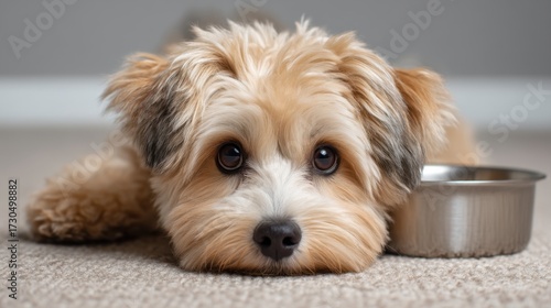 Adorable fluffy dog laying on carpet with big expressive eyes next to an empty stainless steel bowl looking patiently for food and companionship.