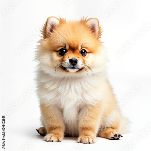Adorable fluffy Pomeranian puppy sits calmly against white studio backdrop. Cute little pet. Purebred puppy shows calm disposition. Studio shot fluffy fur. Young animal looks directly at viewer.