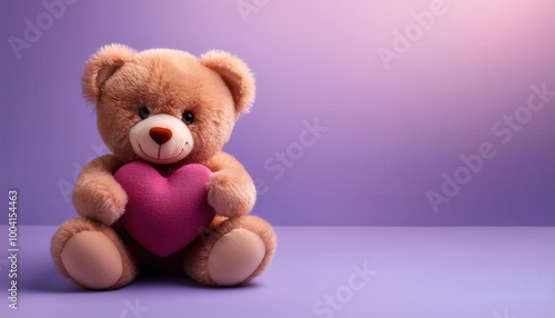 Adorable Fluffy Teddy Bear Holding a Red Heart, Set Against a Soft Purple Background, Representing Love, Affection, and Warmth. Perfect for Valentine's Day, Friendship, or Gift Themed Concepts