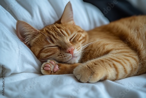 Adorable Ginger Cat Sleeping Peacefully on a Soft White Blanket Cute Pet Portrait of a Cozy Feline : Generative AI
