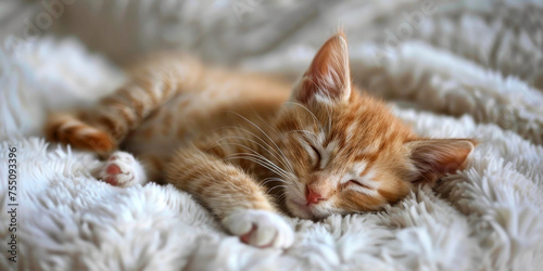 Adorable ginger kitten enjoying a nap, wrapped in a soft, fluffy white blanket