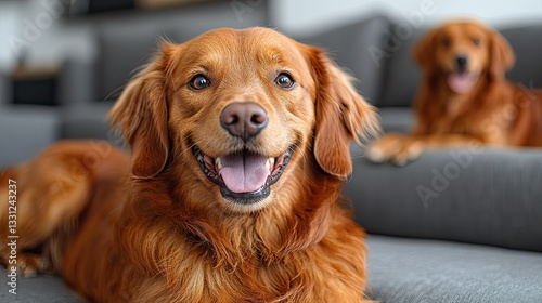 Adorable Golden Retriever Portraits: Two Happy Dogs Relaxing on a Cozy Sofa