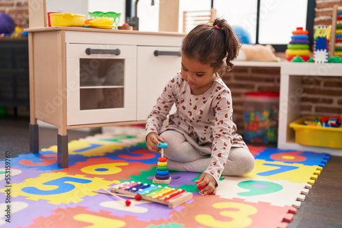 Adorable hispanic girl playing with hoops game sitting on floor at kindergarten