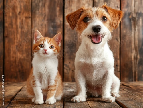 Adorable kitten and puppy sitting together portrait eye level studio shot on wooden floor and backdrop cute pets friendship