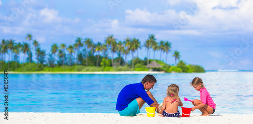 Adorable little girls and dad playing with beach toys on summer