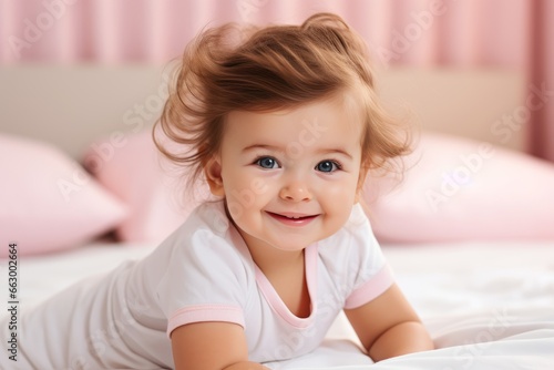 Adorable Newborn Smiling Baby Girl in Light Cloth in Bright Pink Bedroom