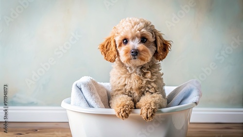Adorable poodle puppy sitting in bathtub with towel in background, puppy, poodle, cute, sitting, bathtub, towel, background