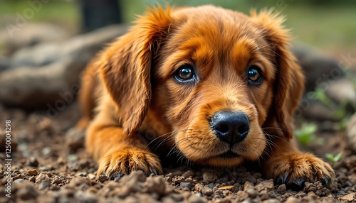 Adorable Red Puppy Lying on Ground Outdoors