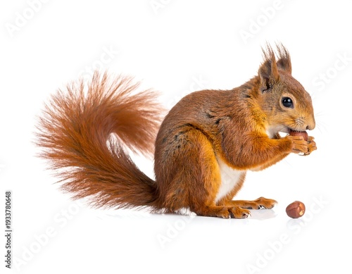 Adorable red squirrel holding a nut in its paws, perched against a clean, white backdrop