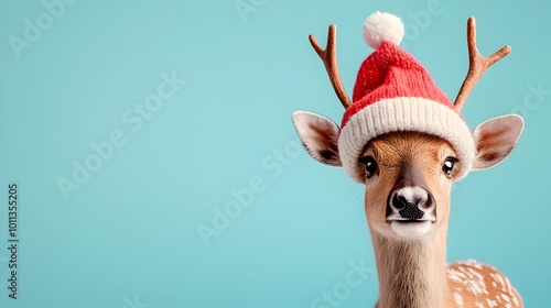 Adorable Reindeer Wearing Christmas Hat on Pastel Blue Background for Festive Design