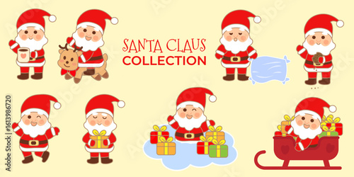 Adorable Santa Claus collection in kawaii flat style. Santa with gifts, sleigh, reindeer, cookies, hot cocoa, and more festive poses. Perfect for Christmas cards, stickers, packaging, and decor.