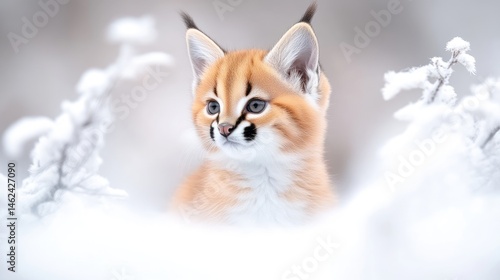 Adorable snow-covered kitten in winter wonderland. A small, fluffy, orange-and-white kitten gazes attentively through a snowy landscape. Soft light bathes the scene
