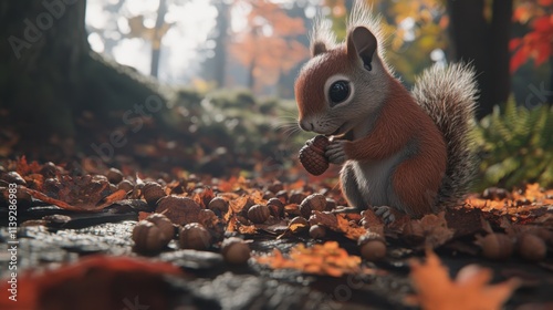 Adorable Squirrel Eating Acorn Among Colorful Autumn Leaves