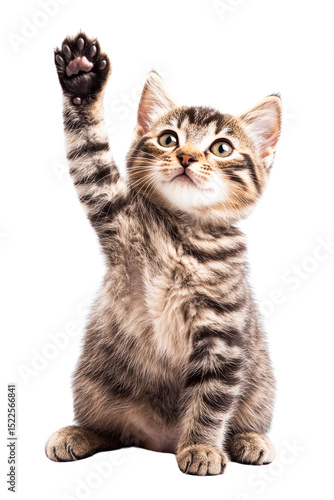 Adorable tabby kitten raising paw, isolated on transparent background