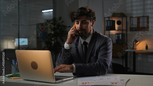 Adult business man manager sitting at desk working on laptop in office overtime in evening, typing on computer answers call, talking on smartphone.