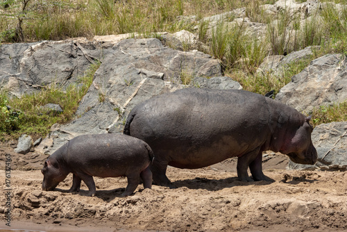 Adult Common Hippopotamus (Hippopotamus amphibius) with its calf on a dry riverbank in Maasai Mara National Reserve