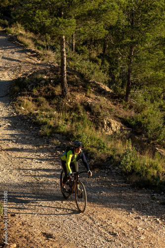 Adult enjoying outdoor sport, riding a gravel bike on a dusty mountain trail surrounded by green trees and nature, experiencing adventure and fitness in costa blanca - stock photo