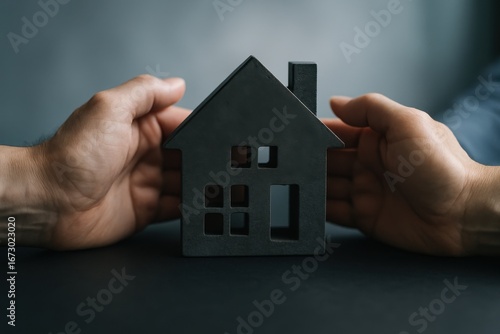 Adult hands gently surrounding a dark grey house model, symbolizing home protection and security