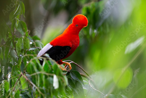 adult male andean cock-of-the-rock (rupicola peruvianus, subspecies sanguin) perching on a branch