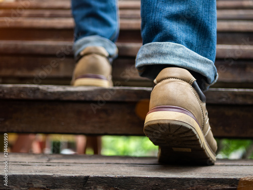 Adult man walking up the wooden stairs. Moving forward Concept.