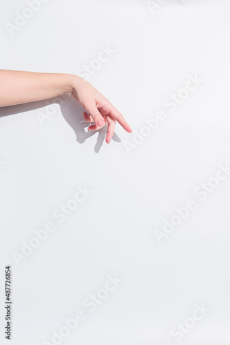 Adult woman hand to hold something flat, isolated on white. Copy space banner for advert advertisement