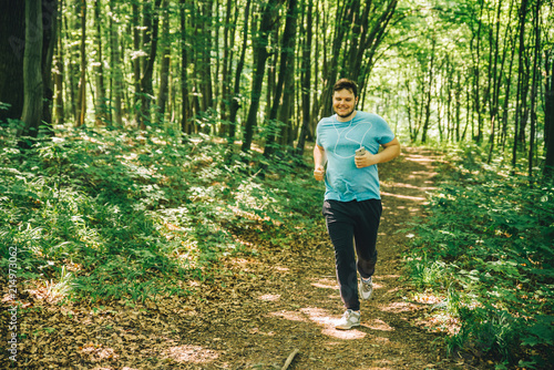 adult young man running in woods. copy space. smiling