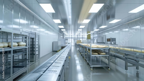 Advanced industrial bakery with automated conveyor belts, production of bread and pastries in a clean and efficient factory setting, bright and organized