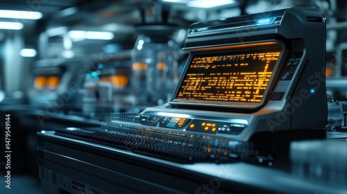Advanced industrial control computer with high-resolution display showing complex digital data and programming interface in a modern high-tech manufactu environment