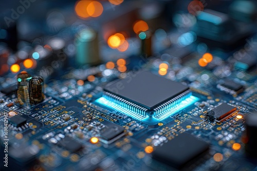 Advanced Microchip Processor Glowing Blue on Futuristic Circuit Board Technology.