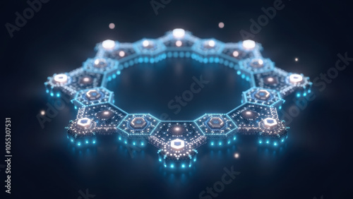 Advanced molecular structure with a ring of illuminated atoms, showcasing a futuristic science concept.