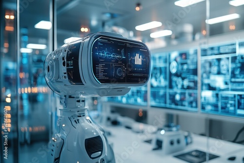 Advanced Robot in High-Tech Laboratory with Interactive Display Screens