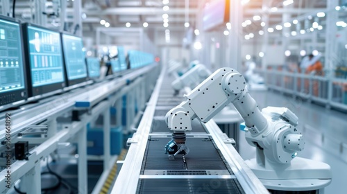 Advanced Robotic Arm Assembly Line in High-Tech Automation Factory for Industrial Innovation