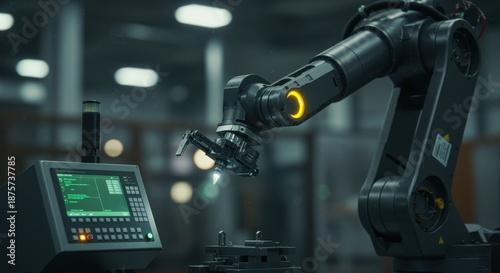 Advanced robotic arm precisely working with industrial control panel in a modern factory