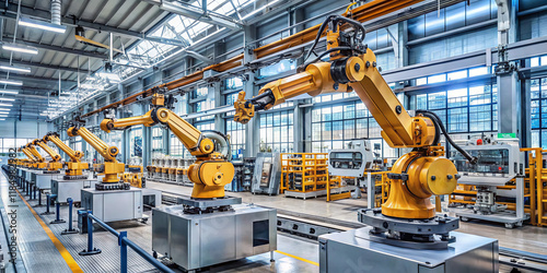 Advanced robotic arms are engaged in precise assembly work within a spacious manufacturing facility. The bright interior is filled with machinery and tools, highlighting automation