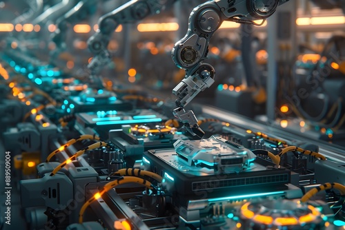 Advanced robotics arms meticulously assembling intricate components of next-gen HDDs in a sterile, high-tech clean room environment