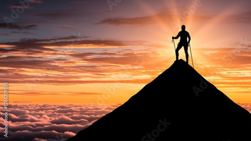Adventurers Overcoming Challenges in Stunning Sunrise View from Mountain Summit with Clouds Below
